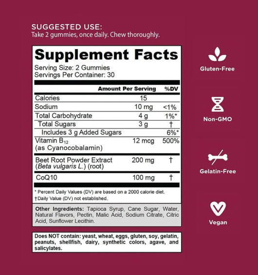Key Ingredients: CoQ10, Beet Root Powder Extract, Vitamin B12