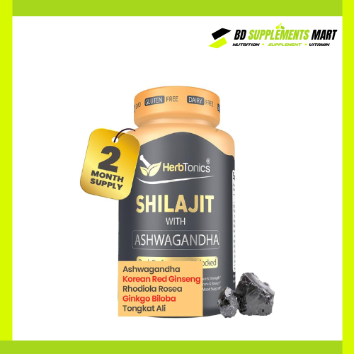 Available at bdsupplementshop.com, you can trust the authenticity and quality of Herb Tonics Shilajit with Ashwagandha – 60 Vegetarian Capsules.