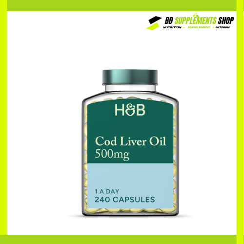 Buy Holland & Barrett Cod Liver Oil, 500mg, (60 Capsules) at the best price in Bangladesh from bdsupplementshop.com. Rich in Omega-3, Vitamin A & D, it supports heart, bone, brain, and immune health — 100% authentic and imported from the UK.