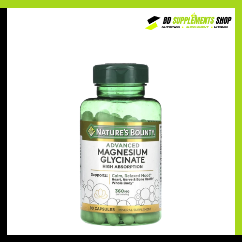 Order today from bdsupplementshop.com to get Nature’s Bounty Advanced Magnesium Glycinate 360 mg (90 Capsules) at the best price in Bangladesh and support your muscle, nerve, and bone health efficiently.