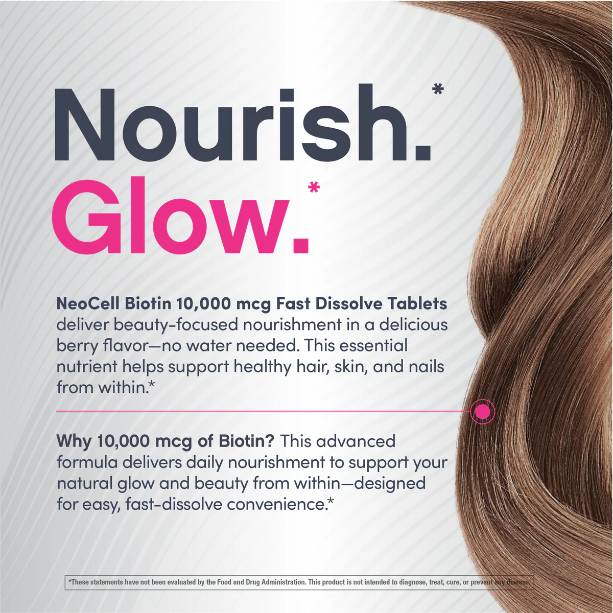NeoCell Biotin 10000 mcg Fast Dissolve 180 Fast Dissolve Tablets is a premium beauty and wellness supplement designed to support healthy hair, skin, and nails. Biotin (Vitamin B7) plays a crucial role in keratin production, which is essential for strong hair and nails, as well as healthy skin.