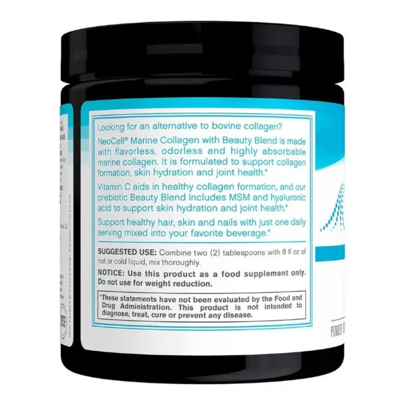 NeoCell Marine Collagen Powder With Hyaluronic Acid, MSM, & Vitamin C (Unflavored, 7 oz / 200 g) is a powerful, multi-benefit formula that promotes radiant skin, strong hair and nails, and flexible joints. With its high-quality marine collagen and synergistic nutrients, it helps you look and feel younger naturally.