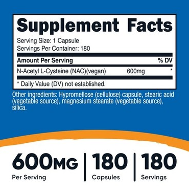 Nutricost NAC N-Acetyl L-Cysteine 600 mg 180 Capsules is formulated to deliver high-quality NAC in an easy-to-swallow capsule form. NAC is a precursor to glutathione, one of the body’s most powerful antioxidants, which plays a critical role in detoxification and immune health.