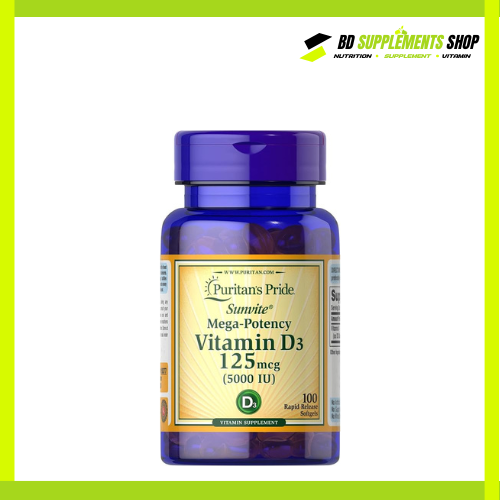 At bdsupplementshop.com, we guarantee 100% authentic Puritan’s Pride Vitamin D3 (125 mcg – 5,000 IU) – 200 Softgels, verified for purity and potency, along with the latest 2025 price in Bangladesh.