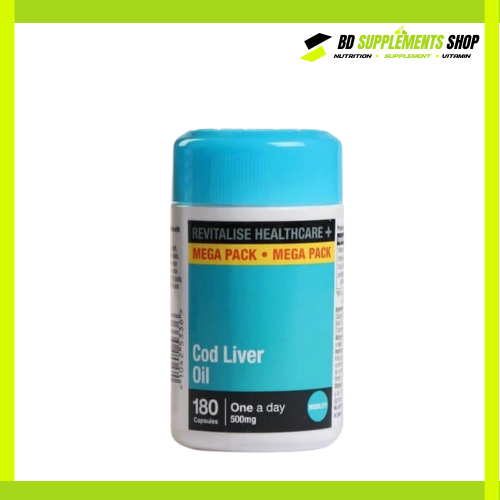 Buy Revitalise Healthcare+ Cod Liver Oil (180 Capsules) | Made in UK at the best price in Bangladesh from bdsupplementshop.com. 100% authentic UK-made cod liver oil rich in Omega-3, Vitamin A & D for heart, joint, and immune support.